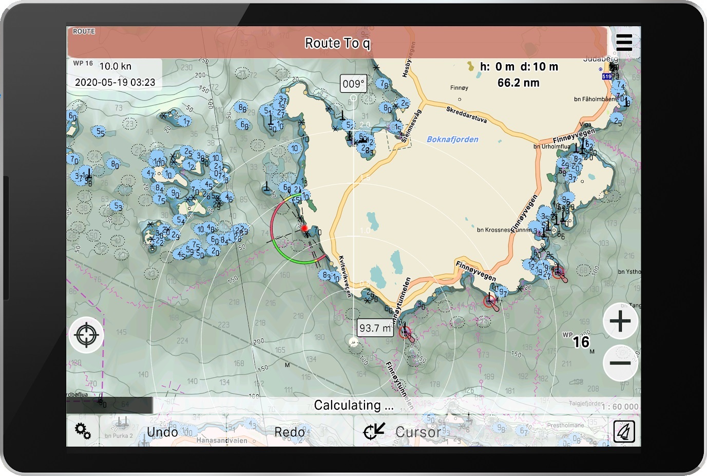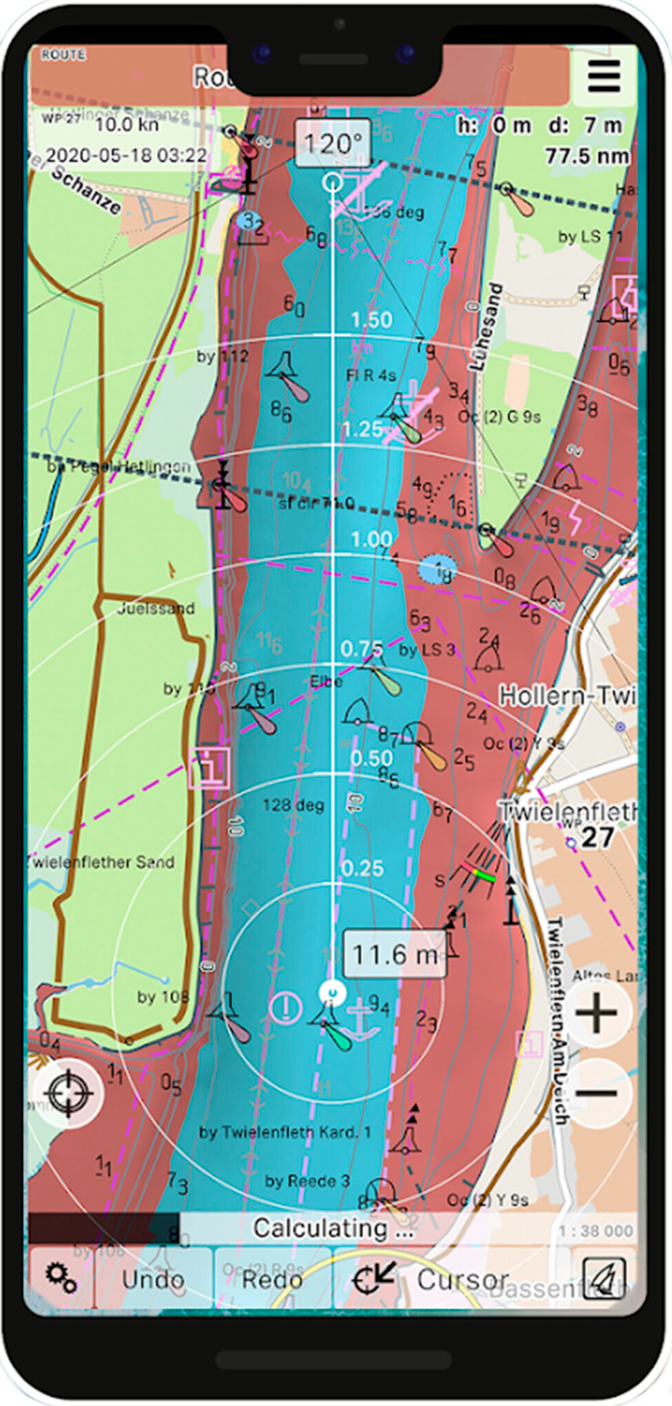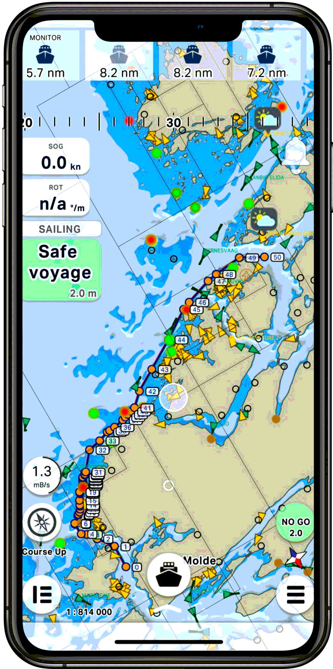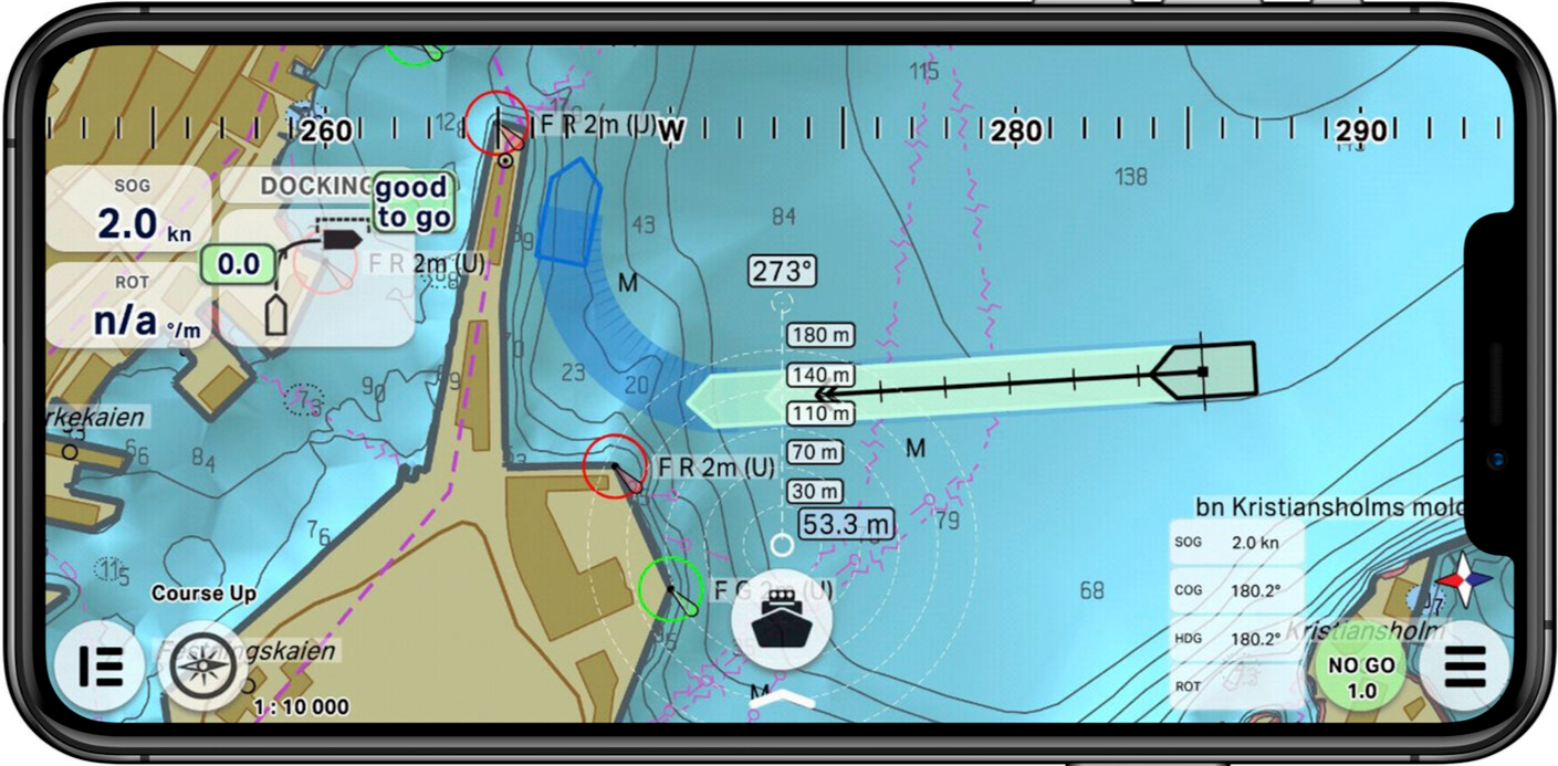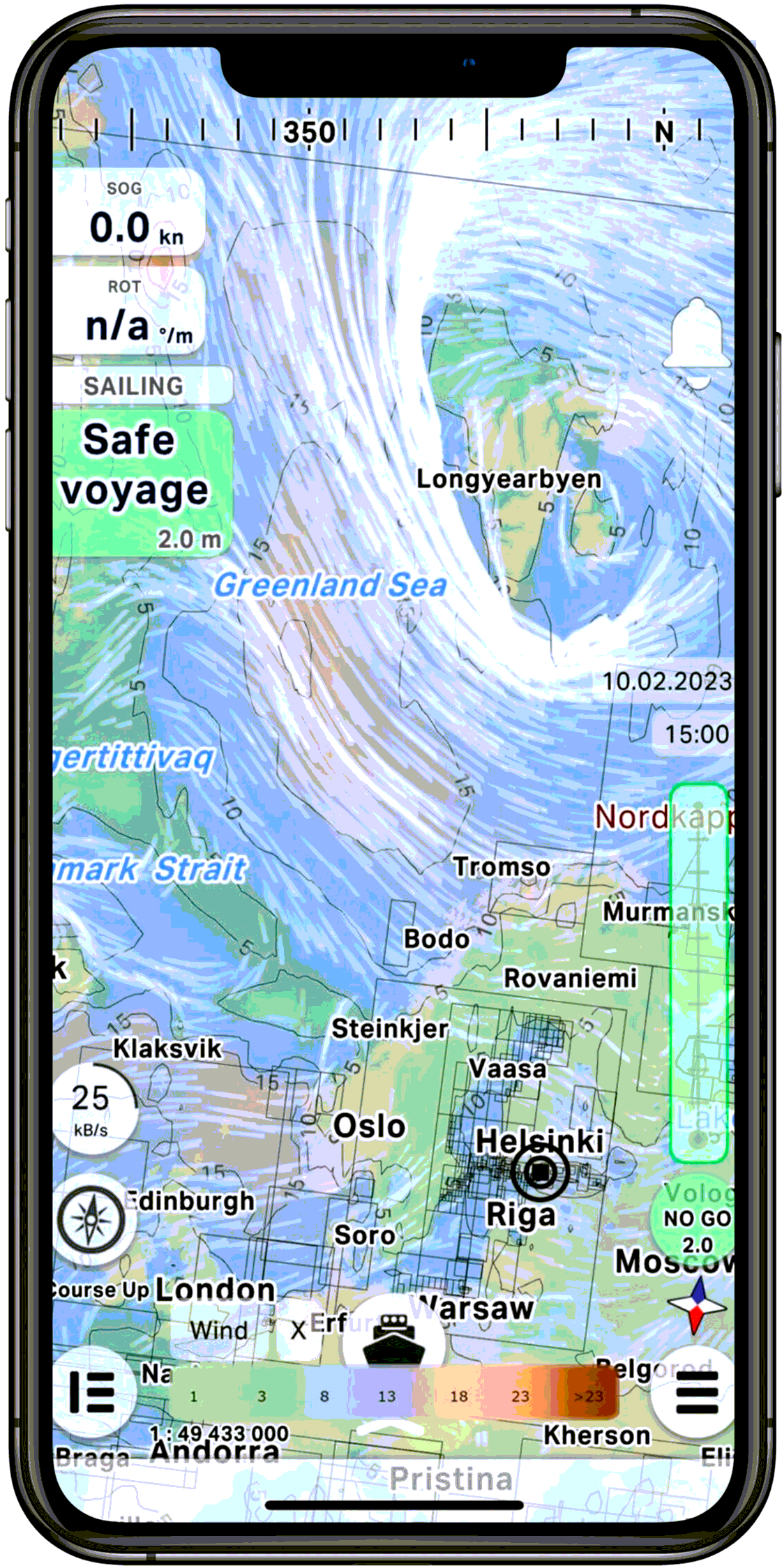 Map can be oriented by North, Course and by Look Ahead (Compass Mode). In combination with “smart ERBL” you may get interesting object information just pointing out phone in this direction. Pulling low bar up customer gets access to sea bottom profile and simulations functions. Swiping on the screen switches between Sailing and Docking modes. In case of alarm, it will be synchronized with mobile Watch if connected.